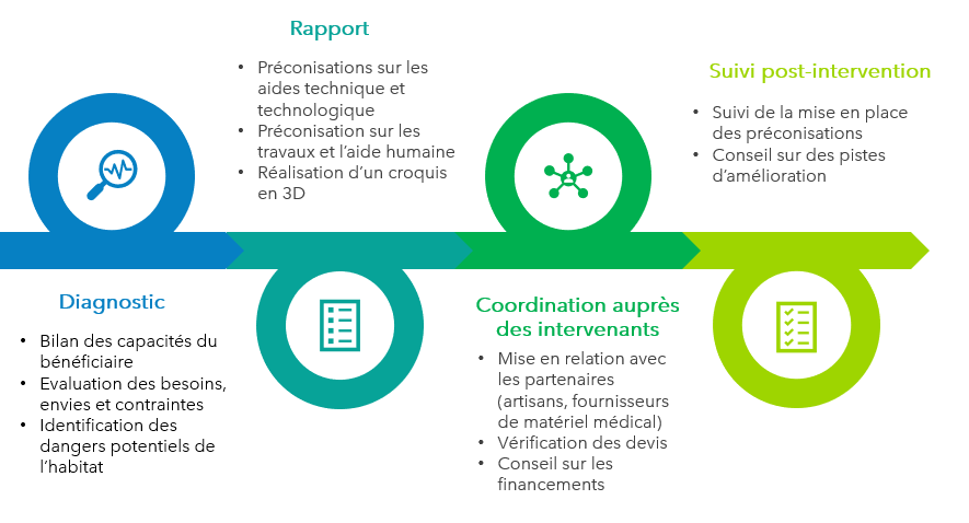 Face à la complexité du parcours, nous proposons une démarche facilitée. Nous préparons le retour à domicile et accompagnons les aidants par la rédaction d’un rapport au patient et d’une liste de travaux avec croquis 3D à destination de l’artisan. Ensuite nous validons le projet, lui conseillons des partenaires de confiance et l’orientons vers les structures aidant au financement des aides techniques.